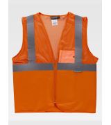 Gilet con parte superiore a rete alta visibilità, chiusura con zip, bande rifrangenti sul petto e sulla schiena.