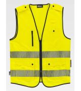Gilet da lavoro tipo safari, chiusura con zip, collo a V, multitasche con chiusura in velcro, dettagli rifrangenti.