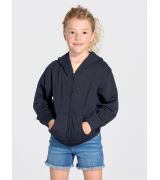 Felpa bambino con cappuccio e zip intera, sgarzata. Cordino cappuccio in tinta. Costina 1x1 con lycra su polsini e girovita. Tasche a marsupio. Cerniera completamente coperta.