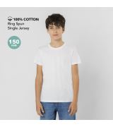 T-shirt bambino/a unisex a manica corta, realizzata in morbido cotone liscio 100% 150 g/m². Con cuciture laterali. Scollo rotondo in costina 1x1 con cuciture tono su tono.