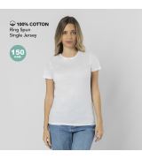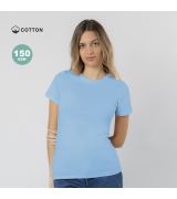 T-shirt a manica corta, vestibilità femminile, realizzata in morbido cotone liscio 100% 150 g/m². Con cuciture laterali. Scollo rotondo in costina 1x1 con cuciture tono su tono.