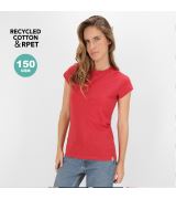 T-shirt da donna realizzata in materiale di cotone riciclato al 60% in combinazione con RPET, tessuto Single Jersey da 150 g/m2. Etichetta facilmente rimovibile. Con logo riciclato sull'etichetta.