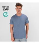 T-shirt adulto realizzata in materiale cotone riciclato al 60% in combinazione con RPET, tessuto Single Jersey, 150 g/m2. Etichetta facilmente rimovibile. Con logo riciclato sull'etichetta 60% Cotone Riciclato Single Jersey/ 40% Poliestere RPET 150 g/ m2