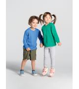 T-shirt bambino/a manica lunga 100% cotone, girocollo. Cuciture laterali. Collo in lycra. Rinforzo da spalla a spalla. Doppia cucitura su collo, maniche e girovita Fettuccia interna da spalla a spalla con ribattitura a doppio ago. N.B. 1/2 disponibile soltanto nei colori: BK,NY,RB,WH,RD.